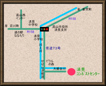 ▼ 周辺地図 ※地図をクリックすると別ウインドウで Google Maps が開きます 農事組合法人 清見コンポストセンター 所在地 〒506-0105 岐阜県高山市清見町三ツ谷2260番地2 ▼ アクセス 自動車の場合 高山西インターチェンジから 約9km(12分)