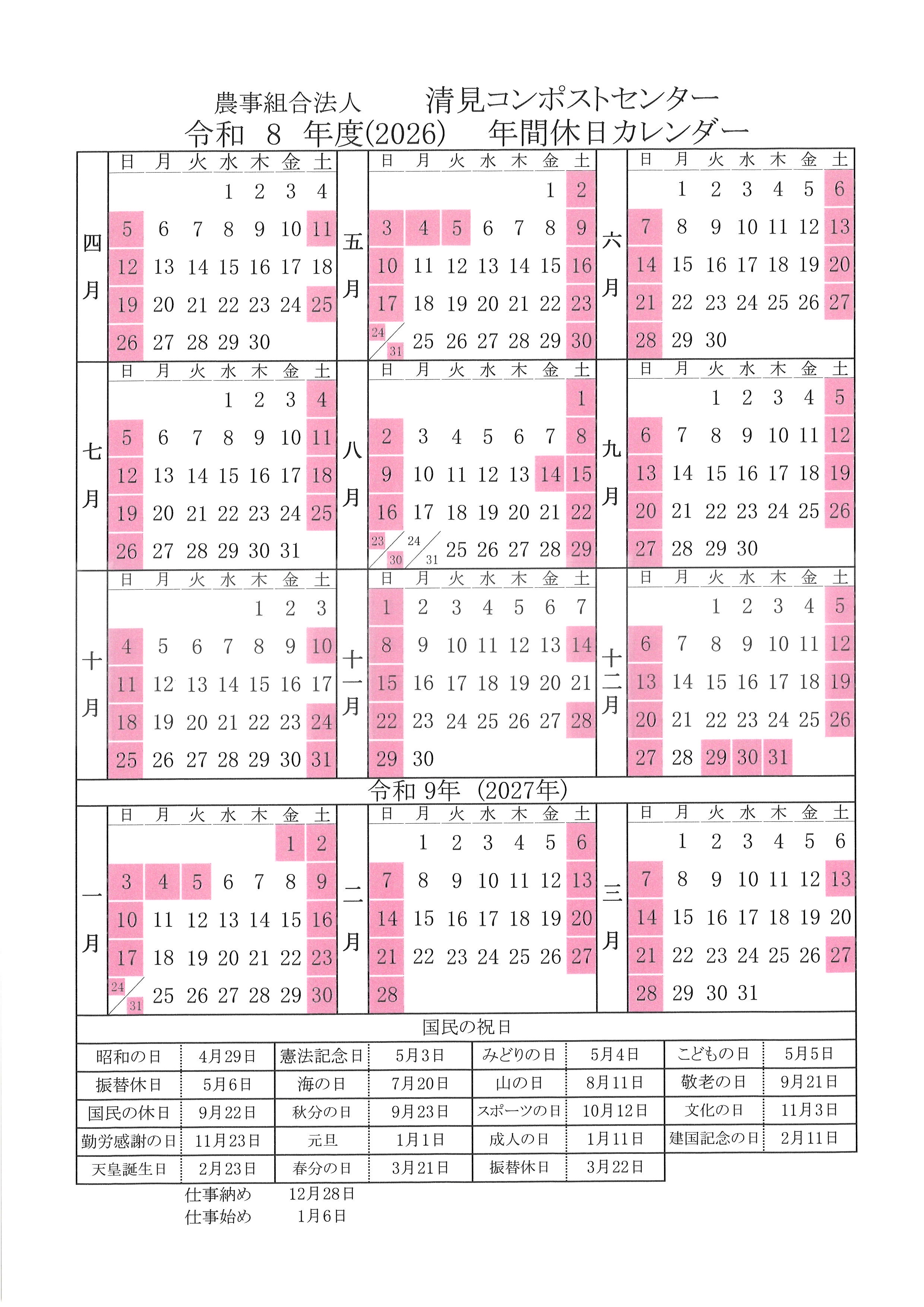 ▼ 休日カレンダー 2026年度 ◆印刷はココから(PDFが別ウィンドウで開きます) 弊社製品についてのお問い合わせは、こちらで受付しております。 ▼ 電話・FAX TEL 0577-68-2764(平日 8:30 ~ 17:00) FAX 0577-68-2564 Mail info@kiyomi-cc.or.jp【メール問い合わせ用QRコード】