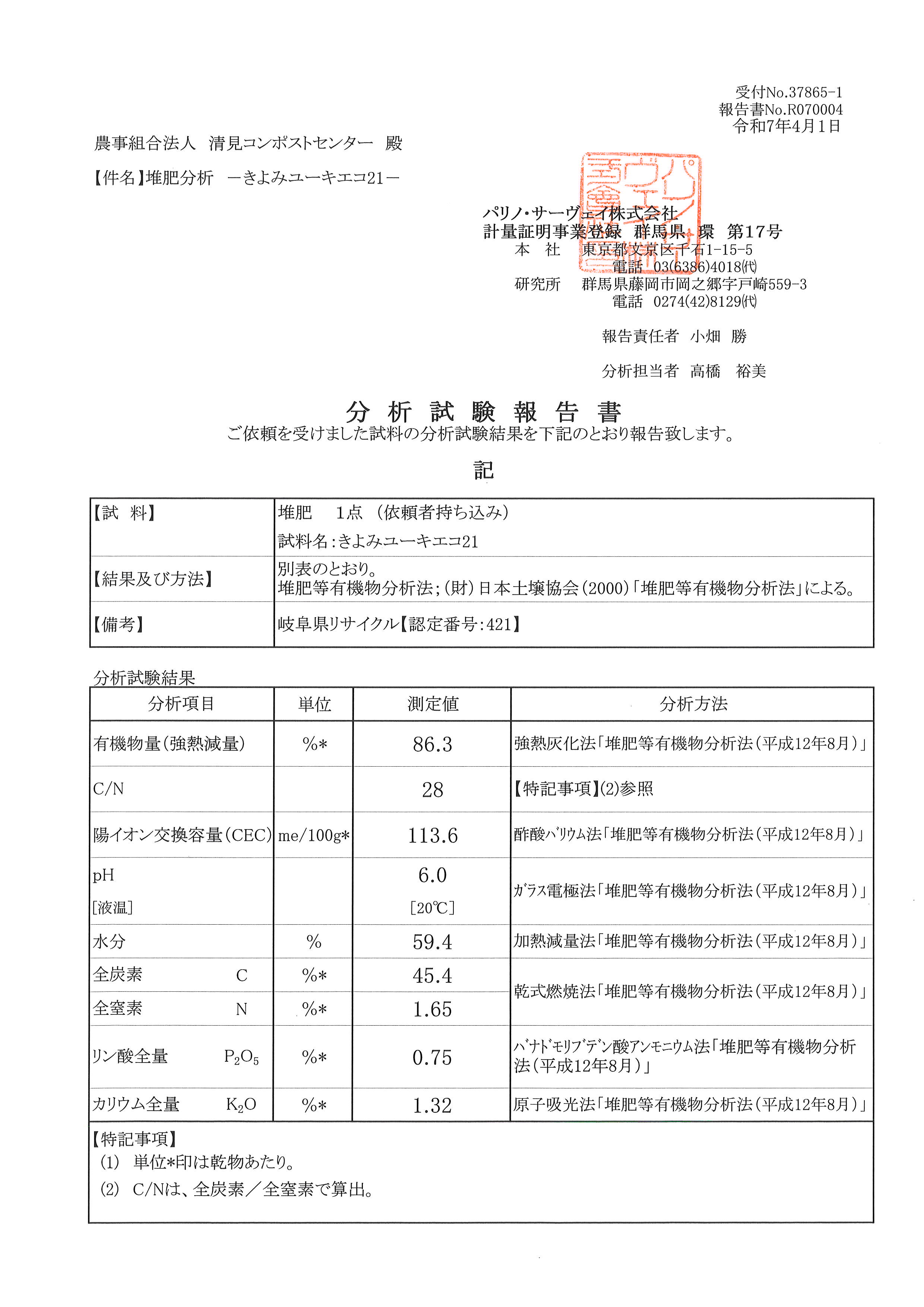 ▼ 成分分析 きよみユーキ 分析試験報告書・幼植物試験報告書 土にまごころ 分析試験報告書・幼植物試験報告書 きよみユーキエコ21 分析試験報告書 きよみユーキ3号 分析試験報告書 ▼実 績 販売実績 農業園芸用 6,321t/年 法面工事用 7,266t/年 生堆肥処理実績 飛騨牛肥育農家 7,616t/年
